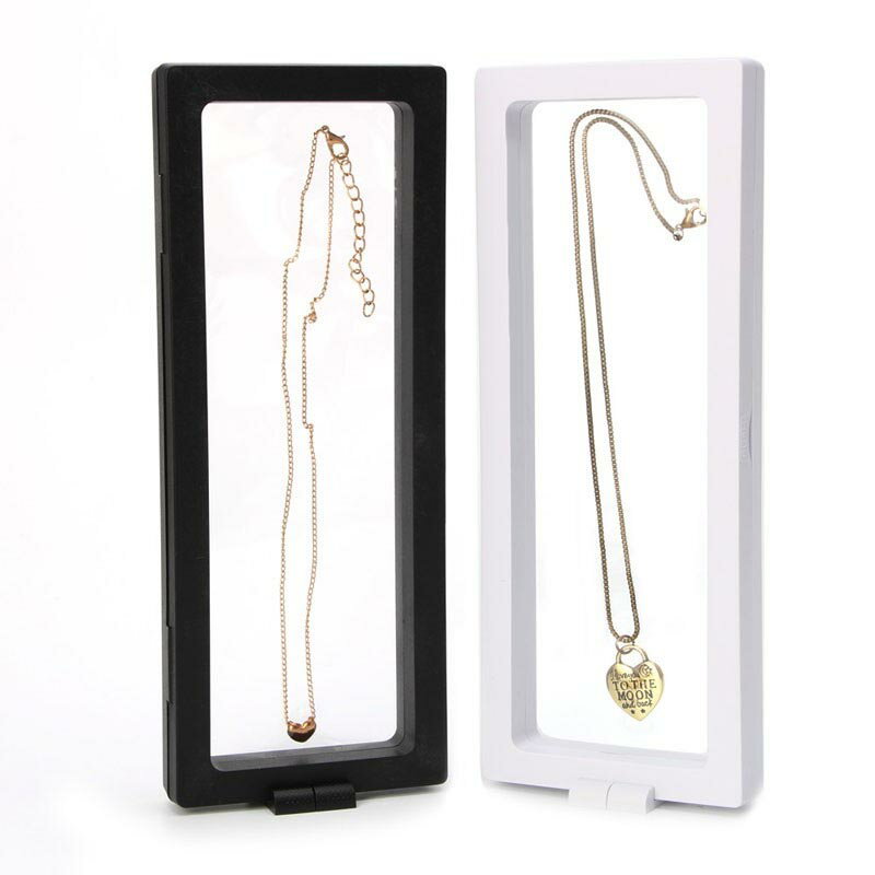 長方形のホワイトとブラックのアクリルの真中に透明のシートが張っているので、それに挟み込むようにジュエリーをディスプレイするだけ。