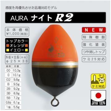 (在庫限り 特価 半額)AURA(アウラ) ナイトR2 オレンジ カン付きウキトップにケミホタル25が装着可能な昼夜兼用モデル。