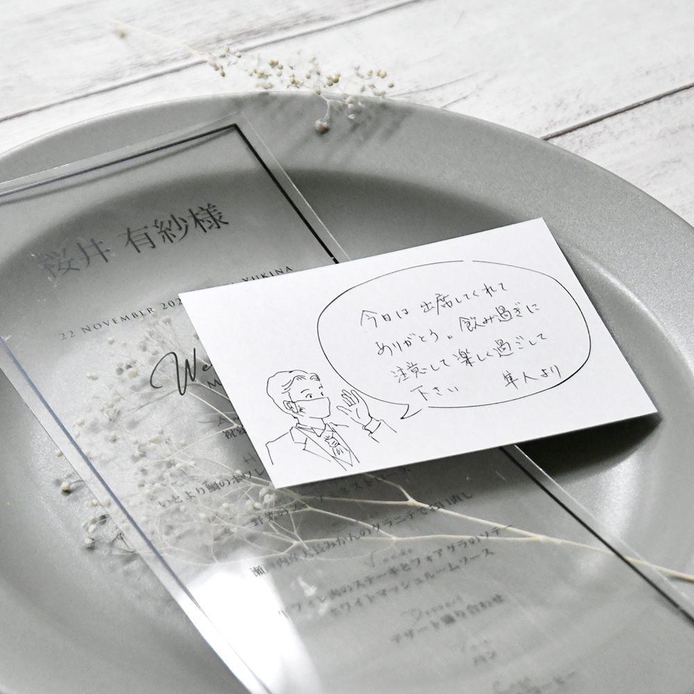 ◆多目的に使える! 手書きメッセージで心からの言葉を添えて 安心して出席してもらうよう一言添えて招待状に同封したり、当日ゲストテーブルに置いたり、様々な使い方ができます。