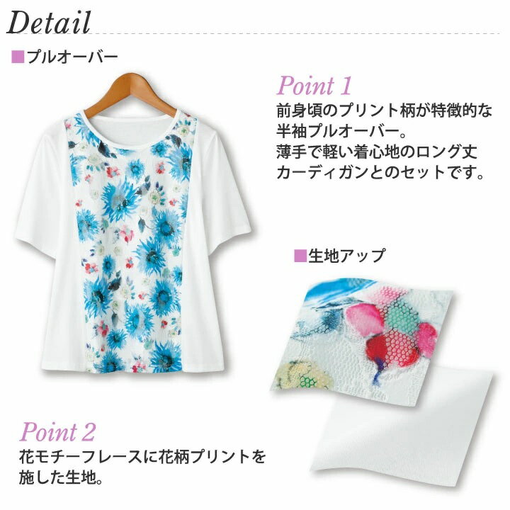 花モチーフレースの鮮やかなプリントのプルオーバーと、 美しいドレープ感のあるロング丈カーディガンのアンサンブルセット。